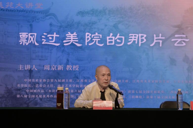 本次讲座中,周京新教授以“飘过美院的那片云”为题,结合自身求学与创作经历,回顾南京艺术学院的发展历程及其个人艺术探索的心路轨迹,深入阐释艺术与生活的内在关联,并对素描教学与创作实践进行深刻思考。他分享了自我初入校园时的惶恐及通过勤学苦练得以克服的过程,提及20世纪80年代初期艰苦的写生条件,强调真正的艺术源于对现实的深刻体察与情感积淀,重在以个体感知凝练普遍经验,运用真诚的艺术语言传递独特的生命气质。另外,在素描教学方面,他主张拓宽认知维度、推动多专业协同教学,并介绍了将素描课程后两周调整为创作实践的教学创新,可以进一步激发学生的真实态度与绘画独特性。他提出创作训练应贯穿中国画专业培养全程,鼓励学生提早尝试、积极投稿以积累实践经验。